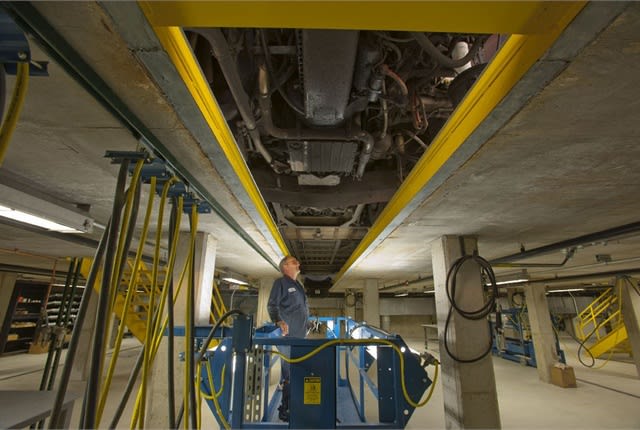 Montgomery County has four of these maintenance and inspection pits that have air-driven platforms underneath. The technician also has access to fluids, oil filters, and grease stored in the pit so he can do all his work there, Griffiths said.