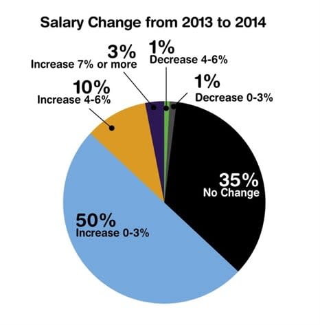 Those who reported salary increases were up this year in comparison to the prior year and significantly higher than 2012 survey results, which is a possible sign of the improving economy. While the vast majority of the raises were 3% or lower, more reported increases of higher than 3% this year than last year.