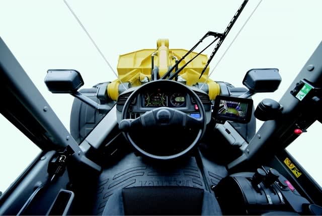 The Komatsu WA270-8 wheel loader cab includes a monitor offering Ecology Guidance, a rear-view monitor, auto-idle shutdown, an auxiliary jack, and two 12-volt ports. Photo courtesy of Komatsu