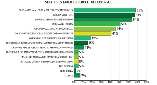 There are two main ways fleets are reducing fuel costs: one is to change purchasing methods and the other is to reduce fuel consumption. Check out the statistics on fuel cost reduction strategies fleet managers have implemented. More common methods to reduce fuel expenses include purchasing more fuel efficient vehicles and enforcing anti-idling policies. However, other fleet managers are trying out alternative ways to reduce fuel costs.