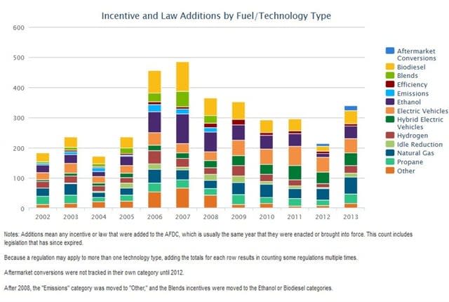 This chart shows trends in incentives and laws related to alternative fuels and advanced vehicles, enacted in all 50 states and the District of Columbia from 2002 to 2013. Visit www.afdc.energy.gov/laws/ for information on federal and state incentives and laws. Source: National Renewable Energy Laboratory