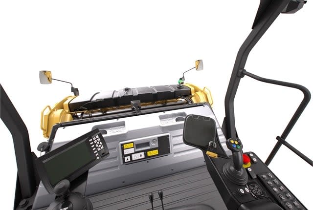 The operator’s control station comes with standard 180-degree seating and optional 360-degree positioning. A color display allows the operator to monitor areas of coverage and the number of passes made. Photo courtesy of Caterpillar