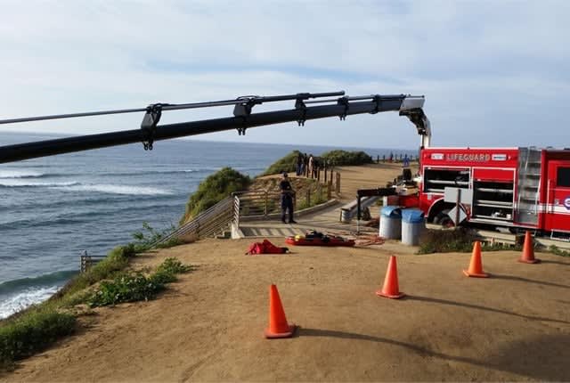 Whenever someone is stuck on a cliff, especially if the person is injured, SDFD lifeguards use their crane to send down a lifeguard, stretcher, and paramedic to the patient. Once the patient is loaded onto the stretcher, the response team hoists the patient, along with the paramedic, up the hill and provides immediate assistance or sends them to a nearby hospital, depending on the severity of the situation.