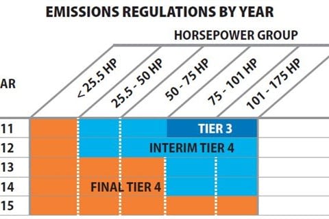 The company said that regulatory dates for engines 75 hp and above will be implemented in stages starting in 2014 and 2015. Particulate matter levels established by interim Tier 4 regulations will be maintained, but regulations mandate an additional 80% reduction in nitrogen oxides (NOx) from previous regulations.