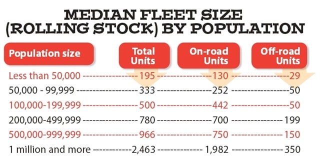 This section examines median fleet sizes and changes in fleet size, and explores why these changes were made. Broken down by population size, the data show a direct relationship between population size served and number of fleet units.
