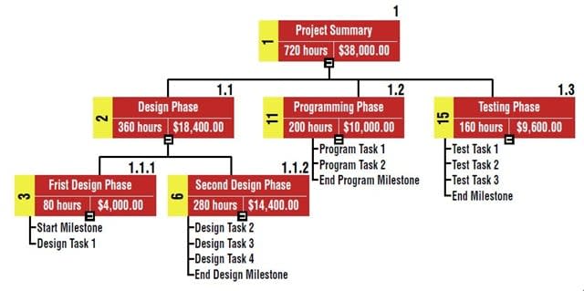 Work Breakdown Structure (WBS). The WBS depicts the hierarchy of tasks that comprise a project. A project is decomposed into component tasks. Each item of the next level will be the tasks involved in the project (or milestones). The levels under that will contain subtasks and work items, the smallest, executable actions that move the project toward completion. WBS allows a project team to visualize the component parts and their relationships before entering them into a project management software program.