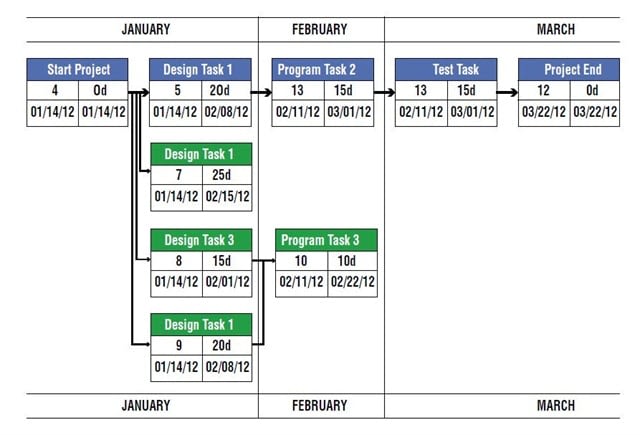 Project management charts are valuable tools in bringing large-scale undertakings to successful conclusions. Charts such as the Gantt, PERT, and Work Breakdown Structure (WBS) models depict the length of time project tasks should take, measured against real time, and reveal task dependencies. The charts provide a visual frame of reference for everyone on the project team. These tools help project managers to plan activities, work out a critical path, and communicate activities with team members. (See examples below.)