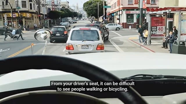 The “Large Vehicle Urban Driving Safety” video is required viewing for municipal and contracted truck drivers operating in San Francisco. The training video offers advanced instruction for navigating city streets. Image courtesy of San Francisco MTA