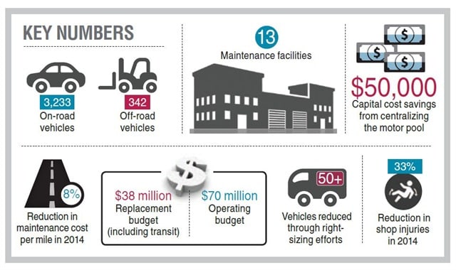 Specific tactics to achieve these goals included improved preventive maintenance (PM) procedures, increased technical expertise, and reduced breakdowns. Each of these focus areas has performance measures that are tied to division targets and employee performance evaluations. Each month, the Division of Fleet Management Services (DFMS) publishes 40 key performance indicators, all of which are published publicly to promote transparency and accountability.
