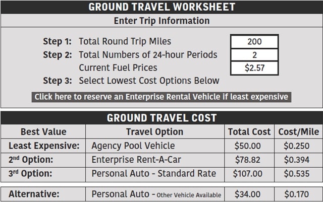 To help drivers make the right selection, the fleet equipped them with a valuable tool: a Ground Travel Worksheet (GTW). Each time a driver needs a car, he or she uses the GTW to compare the cost of a pool vehicle, a rental vehicle, or personal mileage reimbursement (see example on this page).
