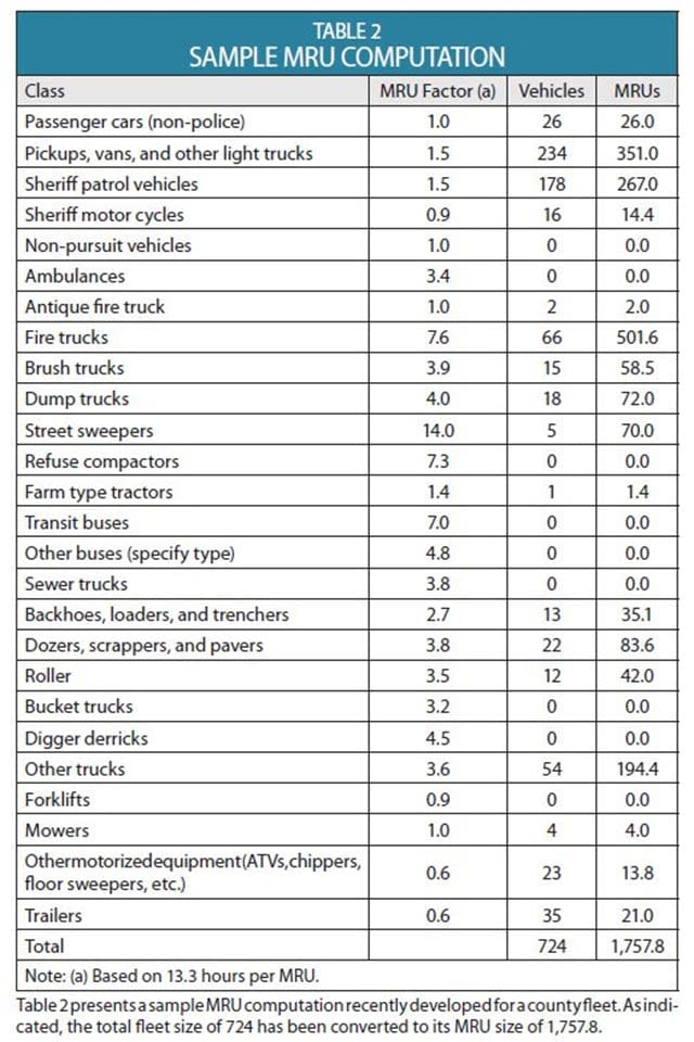 MRU factors by class are then multiplied by the number of vehicles in each class to produce the number of MRUs by class. These factors are summed for the entire fleet to result in the total MRUs, or vehicle equivalents, of the fleet.
