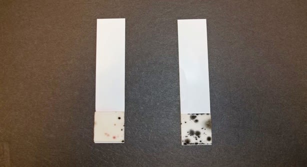 The test strip on the left shows the presence of bacteria in diesel fuel, while the one on the right shows the presence of fungus and mold. Photo: Bell Performance