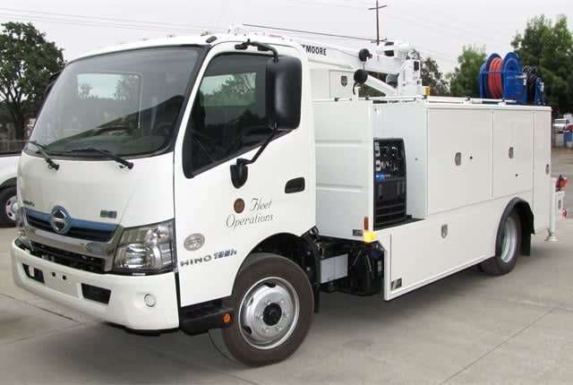 The 2014 Hino 195H hybrid service truck utilizes hybrid electric drive technology to reduce fuel consumption by up to 30% over that of a conventionally powered truck. Photo courtesy of Sonoma County