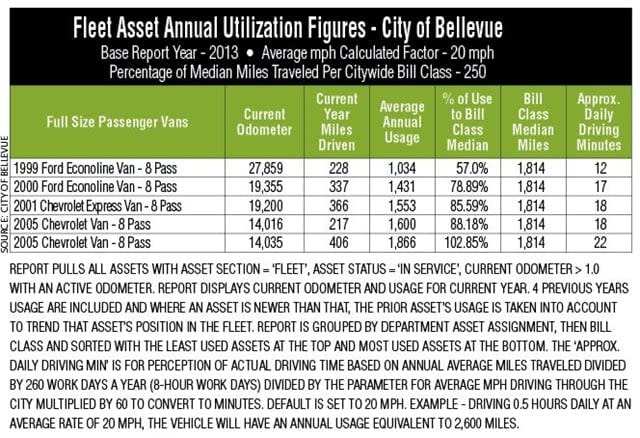 This table shows part of a utilization report the City of Bellevue, Wash., uses annually. When run for the customer, the report is set to show only vehicles that show below 50% of the median miles traveled for easier identification. Excluded from this table is usage history for the prior four years.