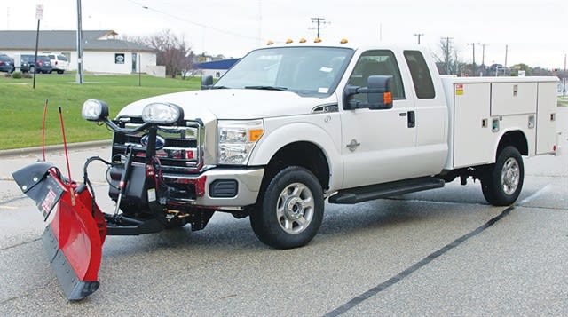 For fleets concerned about staying below 10,000-lb. GVW, upfitting a light- or medium-duty truck with a plow attachment offers more versatility than a dedicated plow truck. Photo courtesy of Merchants Fleet Management