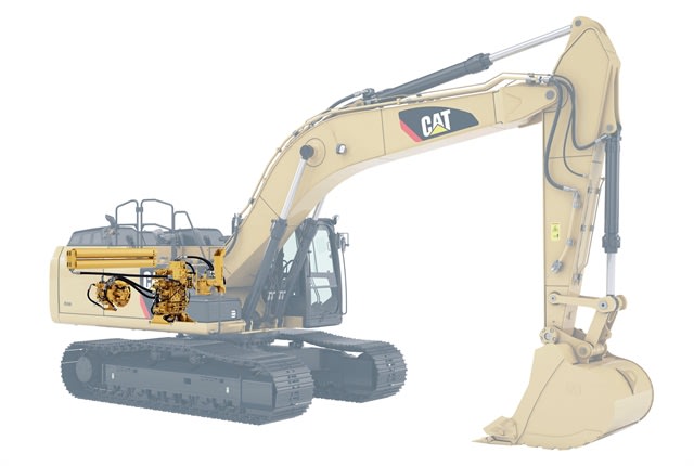 The Caterpillar 336E H hydraulic hybrid excavator uses an electronic standardized programmable (ESP) pump, adaptive control system (ACS) valve, and accumulator to reduce fuel use. Image courtesy of Caterpillar.