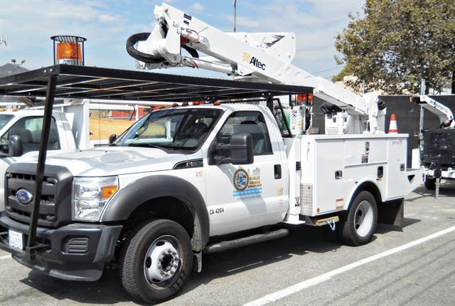 As part of its greener fleet purchases, the City of Glendale, Calif., replaced a larger diesel chassis with a smaller, gasoline-powered Ford F-550. The fleet plans to equip its next aerial trucks with a battery pack for the boom so operators won’t need to run the truck’s engine while the boom is in use.