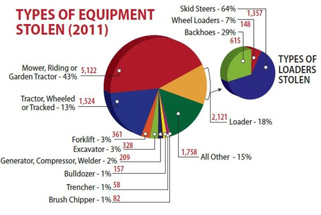 In 2011, mowers were the most common equipment reported to be stolen, followed by loaders. Source: 2011 Heavy Equipment Theft Report.