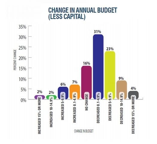 Seventeen percent of respondents reported an increase in budget, while 67% reported a decreased budget. Fleet managers cited rising fuel costs more than any other factor as the reason for their increased budgets. Other factors identified include higher maintenance costs due to aging vehicles, increased labor costs, and additional work through insourcing. One reason cited for reduced costs is improved efficiencies.