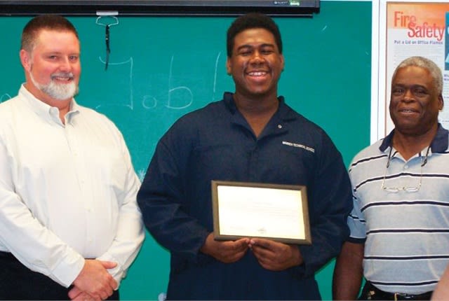Kurwin Bruney (center) holds a certificate for attaining 200 hours of work-based learning with the DeKalb County, Ga., fleet. He is pictured with (left) Robert Gordon, fleet service superintendent, DeKalb County, and Warren Tech teacher Ed Anderson (right).