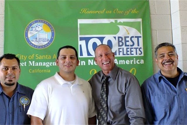Intern Felipe Maldonado (in white) stands with fleet staff (l-r) Ulice Contreras, fleet manager Rick Longobart, and Ruben Esparza. Photo courtesy of City of Santa Ana.