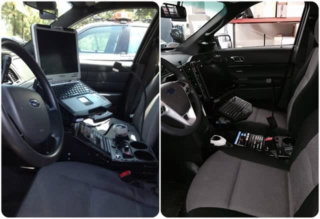 The OCSD made interior changes to its vehicles to improve safety, including adding magnetic mikes, moving the mobile dispatching console higher, and lowering the center console. These images show vehicles before (left) and after (right) the change. Photo courtesy of OCSD
