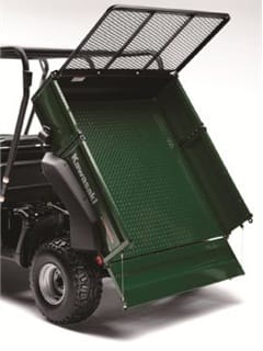 When performing an inspection, operators should lift the bed of the vehicle to check for debris and particles that can collect under the engine area of the machine. Pictured is the Kawasaki Mule 4010 Trans 4x4 diesel vehicle.
