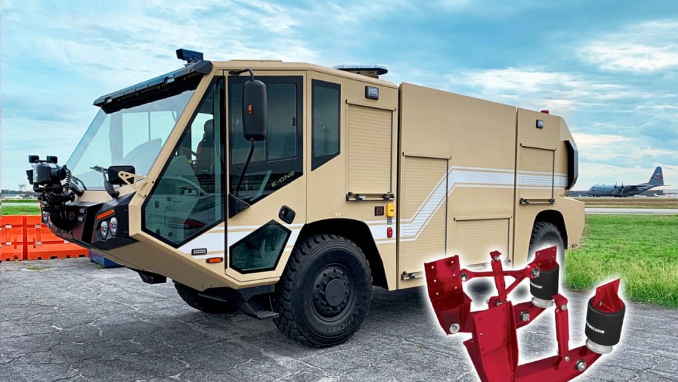 E-One is delivering Titan 4×4 Air Transportable (AT) ARFF P-19C vehicles equipped with Hendrickson’s Long Travel Trailing Arm Suspension to the United States Air Force.