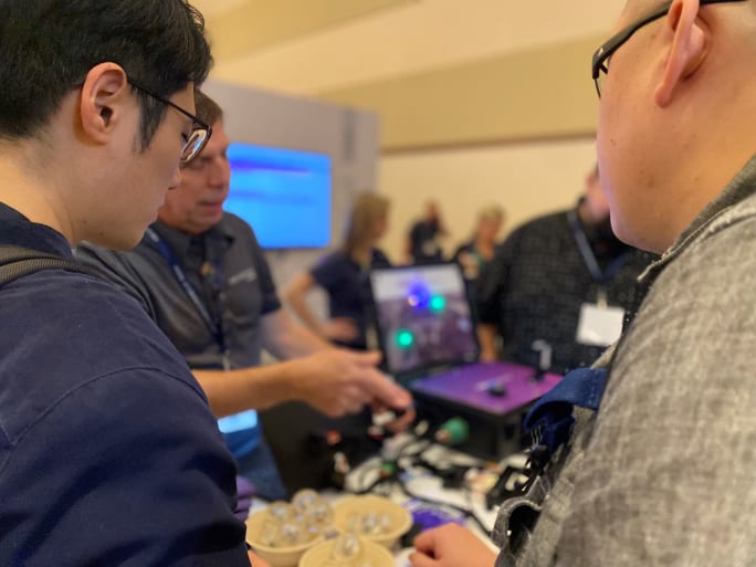 Attendees get a closer look at a booth product as a rep provides the viewers with more information.