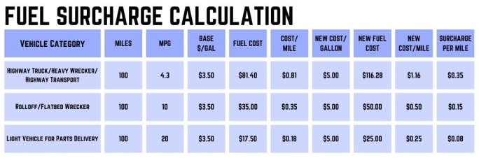 Our method used the simple spreadsheet below. We set three categories of vehicles: heavy truck/transport/wrecker/Landoll; medium-duty flatbed roll-off or rear drag wrecker; and compact car/pickup. We used a base average miles per gallon for each category, the base fuel price/gallon (price at the end of January 2022 for instance in today’s world), and the current price/gallon when the services were rendered. Our spreadsheet calculated the increased fuel cost to our vendors in a cost/mile calculation. Using their invoices, on which mileage was reported, we added the additional fuel cost as calculated by our spreadsheet to their payments. Our finance department appreciated this method as well because it was well justified and documented.