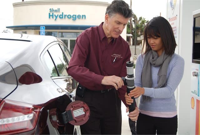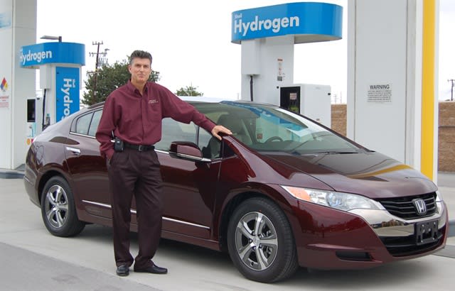 Honda's Fuel Cell Marketing Manager Steve Ellis with the 2012 model FCX Clarity at the Shell hydrogen fueling facility in Torrance. Click on the image for more pictures.
