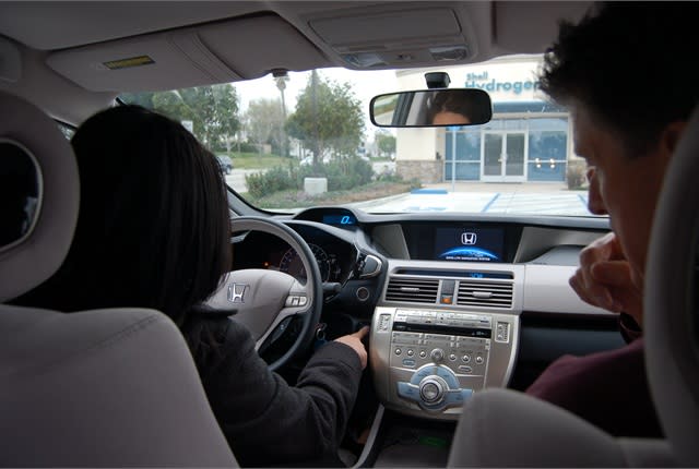 The car: This car drives just like a “regular” car, which is important. We drove around the city and on the freeway and I didn’t notice any major differences from the gasoline-powered sedan I drive. The dashboard has a fancy circular green and blue meter that measures battery power and fuel-cell stack power. Fuel efficiency is excellent. Honda estimates 60 mpg combined highway/city for a 5,000 PSI fill, but we got 63 mpg. The vehicle was surprisingly roomy, although the hydrogen fuel tank intrudes into the truck space by quite a bit. There’s a whirring noise (which sounds like an ambulance) that the Honda team is still working on, but that’s a minor issue.