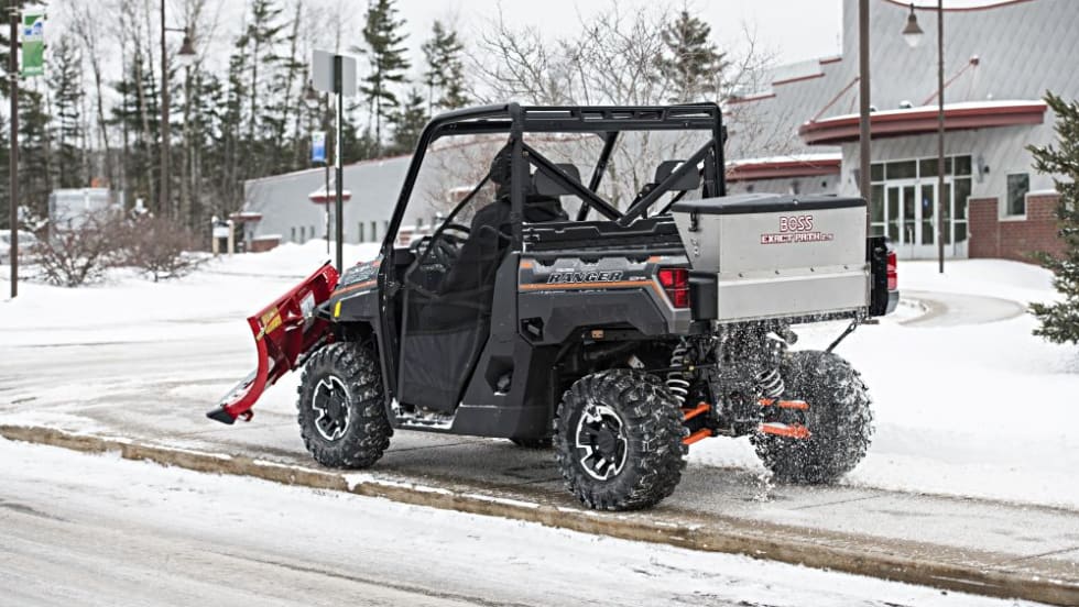 Boss Snowplow’s Exact Path is a drop spreader that precisely drops de-icing material while protecting grass and landscaping.