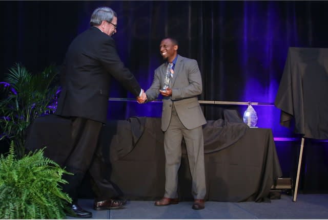 Za Farley from Government Fleet magazine hads an award to Darryl Syler from the City of Dublin, Ohio at GFX. Photo: Natalia King