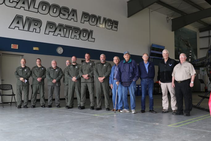 Tuscaloosa PD's current air patrol pilots stand with some of the department's first pilots in the unit. They were invited to the ribbon-cutting for the new hangar.