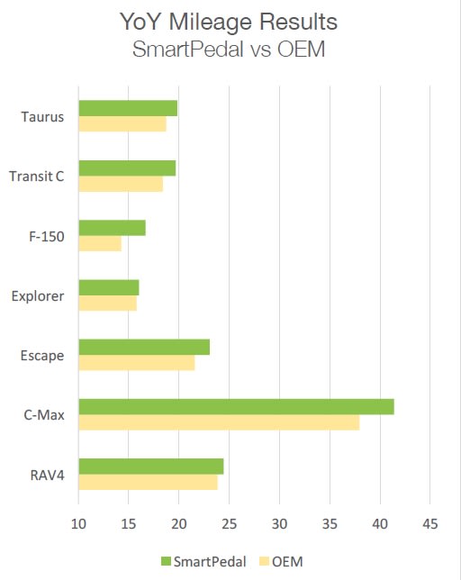 In the SmartPedal trial with Nevada County, Calif., the Ford F-150 had the most gains with the device, averaging nearly a 17% increase in MPG. The Ford Explorer saw the least improvements, with 1.5%.