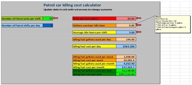 In August 2013, the Department of General Services conducted a study that found unattended, idling patrol cars used $207,000 per year in extra fuel, or 51,149 gallons.