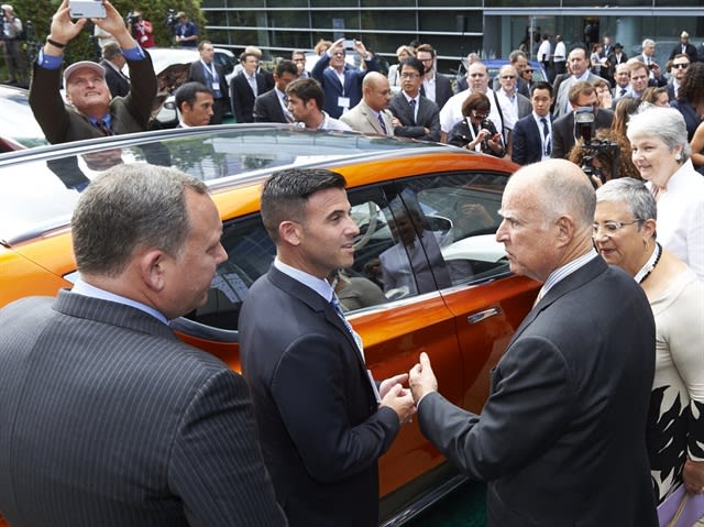 Photo of Calfiornia Gov. Jerry Brown viewing the Chevrolet Bolt concept car by Claudia Wong.