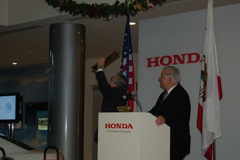 Honda launched the electric vehicle demonstration program with Torrance Mayor Frank Scotto and American Honda Motor Co., Inc. President and CEO Tetsuo Iwamura conducting the first public test drive of a Fit EV prototype and an Accord Sedan test vehicle outfitted with a new two-motor plug-in hybrid system.