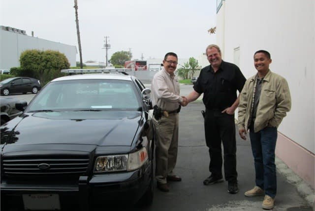 Wild Rose Owner Seton Montgomerie, in black, is shown shaking hands with Commander Raul Alvizo from Delano PD on the day the first reburbished vehicle was delivered. Photo courtesy of Wild Rose