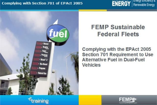 The 15-minute course is intended for anyone with access to a federal fleet vehicle, including drivers, fleet managers, and contractors who operate federal vehicles as a minor portion of their responsibilities. The training is designed to help participants comply with the requirement from Section 701 of the Energy Policy Act (EPAct) of 2005 to use alternative fuel in flex-fuel vehicles.