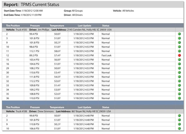 There is also a TPMS current status report that can be scheduled to run daily, weekly, or monthly, which will show every current tire pressure and highlight specific tires with low pressures.