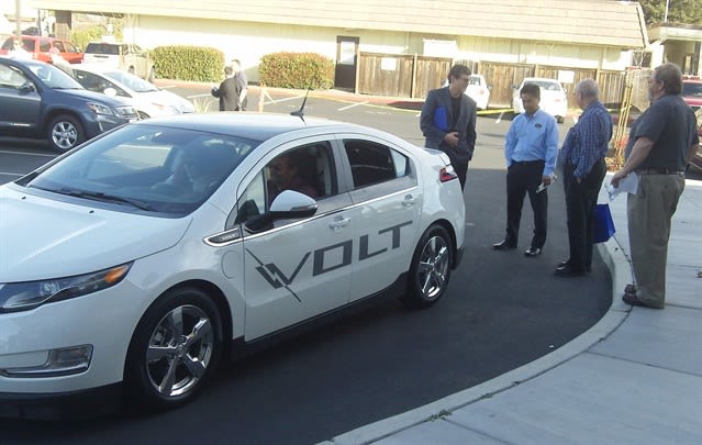 Ed Huestis (Edward P. Huestis Consulting), Clay Okabayashi (GM), Tom Dowling (Sacramento Electric Auto Association), and Guy Hall (Sacramento EAA) discuss the Chevrolet Volt while Andy and Cara Wahl of AC Home Performance test drive it. Photo courtesy of Richard Battersby.