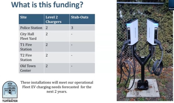 The city of Tumwater, Washington, will be adding 10 chargers for $89,458, which includes the installation of one Level 2 Electric Vehicle charging station at city hall, the police department, two fire stations, and Old Town Center.