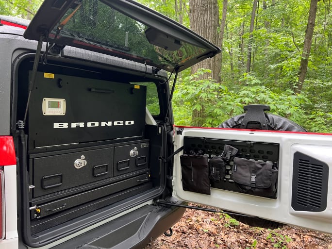 A TruckVault storage unit in the back of the Bronco offers a secure place for the crew to store equipment, including a drone.