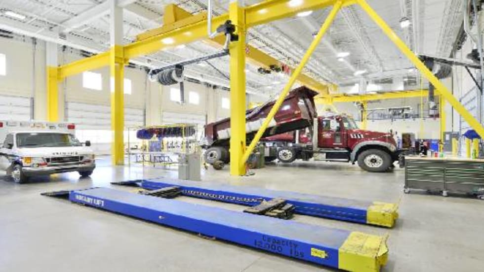 The service center features three heavy vehicle pull-through bays and 12 light vehicle bays.
