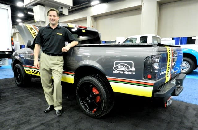 Edward Monfort stands with a display Adomani electric Ford Ranger at the 2013 GFX.