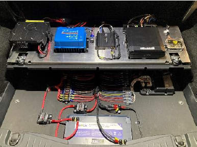 The equipment the vehicle is outfitted with could lead the battery to be drained more quickly. To prevent this, Elliott had a second electrical system installed, which will power the equipment with a separate lithium-ion battery. Initial testing showed the car can run an entire shift with the setup. When running the emergency lighting for a six-hour test, the battery showed a 20% draw. An app allows for officers to monitor the battery and charging condition.