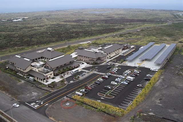 The West Hawaii Civic Center is shown in these aerial photos. The 250 kW photovoltaic array installed on the parking structure provides power for the Center and to charge the County of Hawaii’s new electric vehicle fleet. Photo courtesy of Hawaii County Office of Mayor Billy Kenoi.