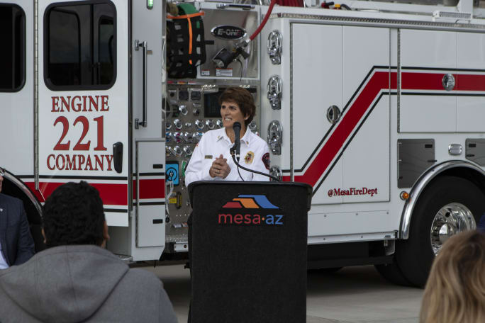 The purchase of the E-ONE Vector supports the city's Climate Action Plan and goal of achieving carbon neutrality by 2050. Mesa Fire Chief Mary Cameli is pictured here at a ceremony celebrating the delivery of the pumper.